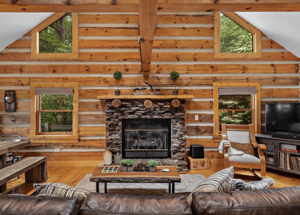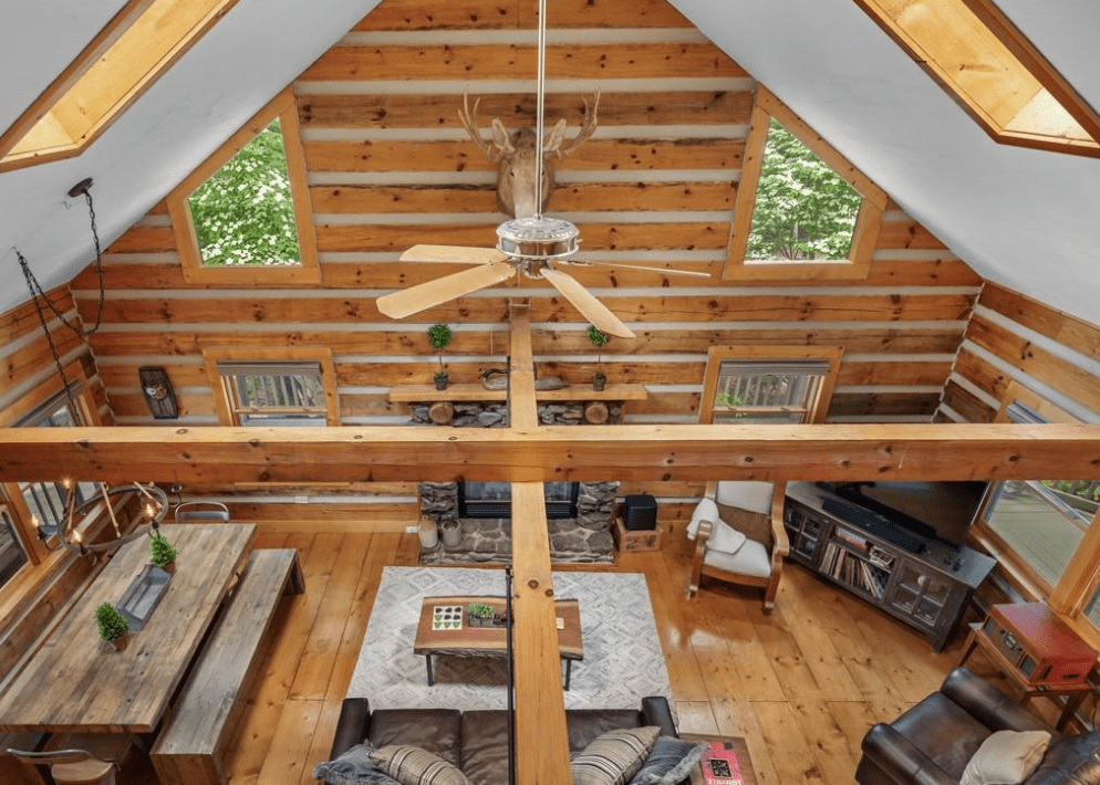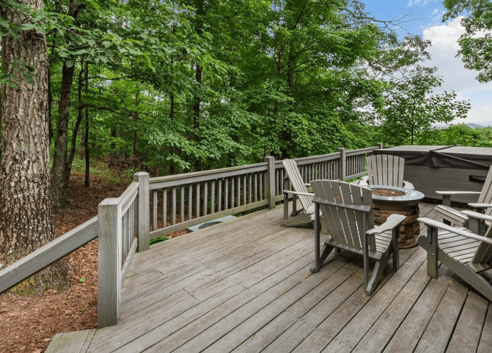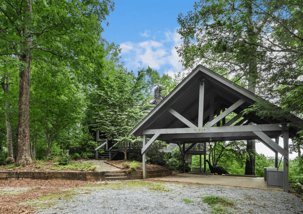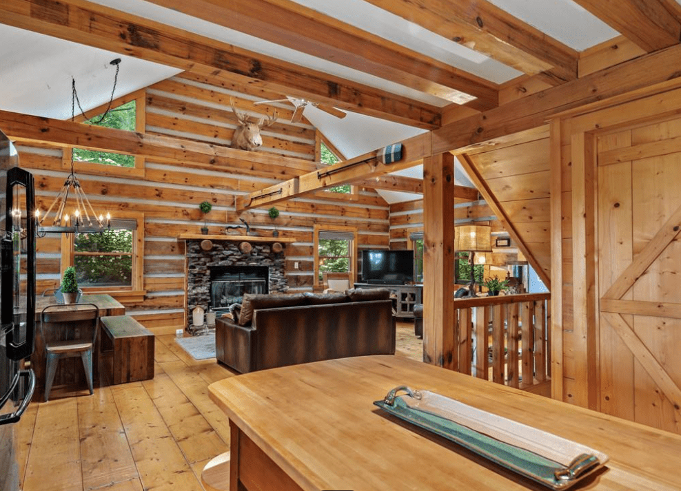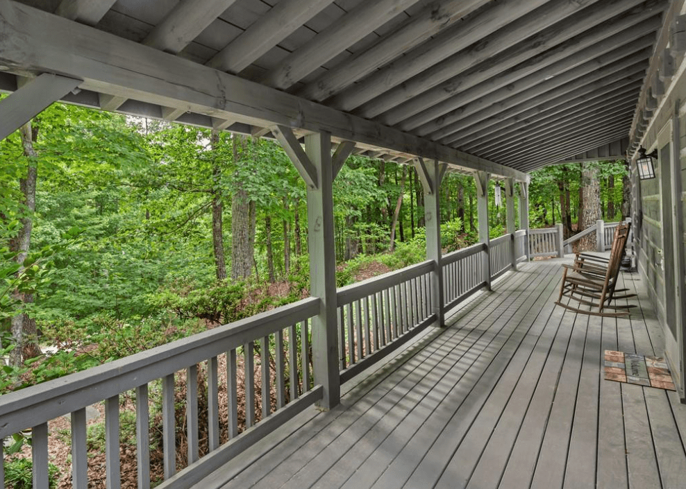 This 1999 era 6 x 14 Timberwright Log Home in North Carolina is stunning. This Timberwright is nearly 2,300 square feet, and it has all the views from the porches, wrap around deck, and patio area. The structure of the outdoor living area is stunning, too.
