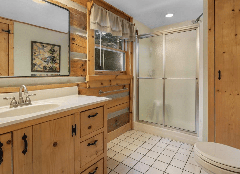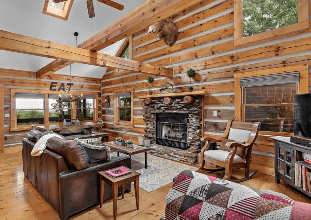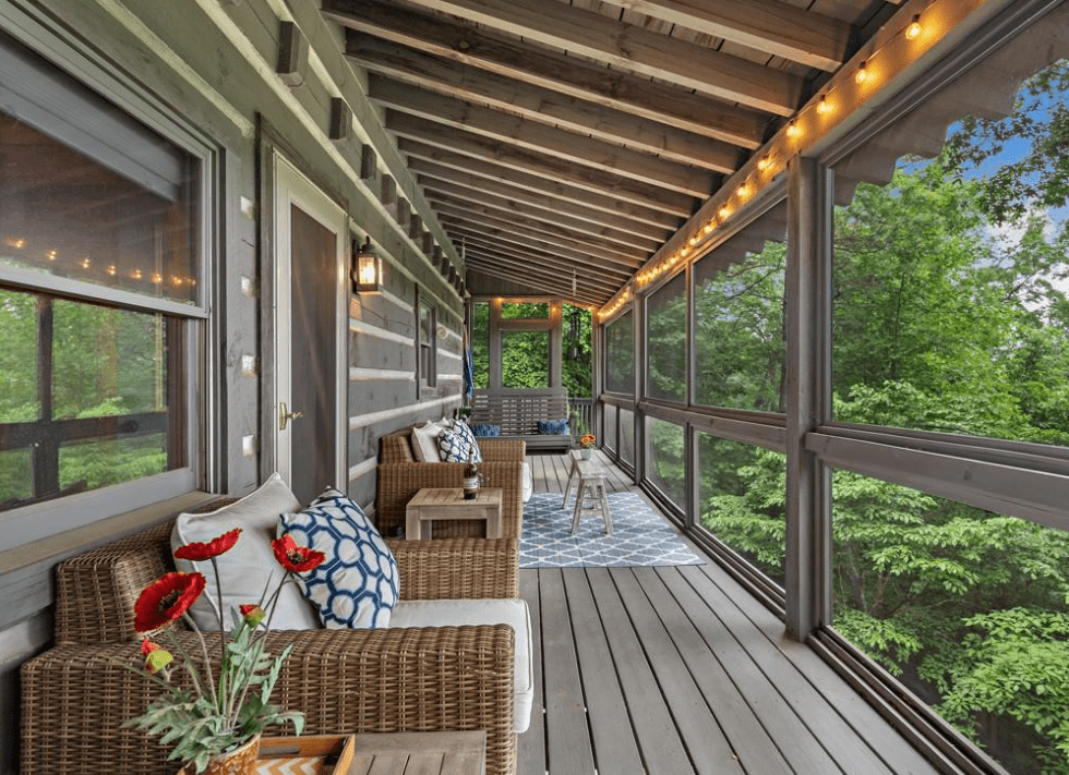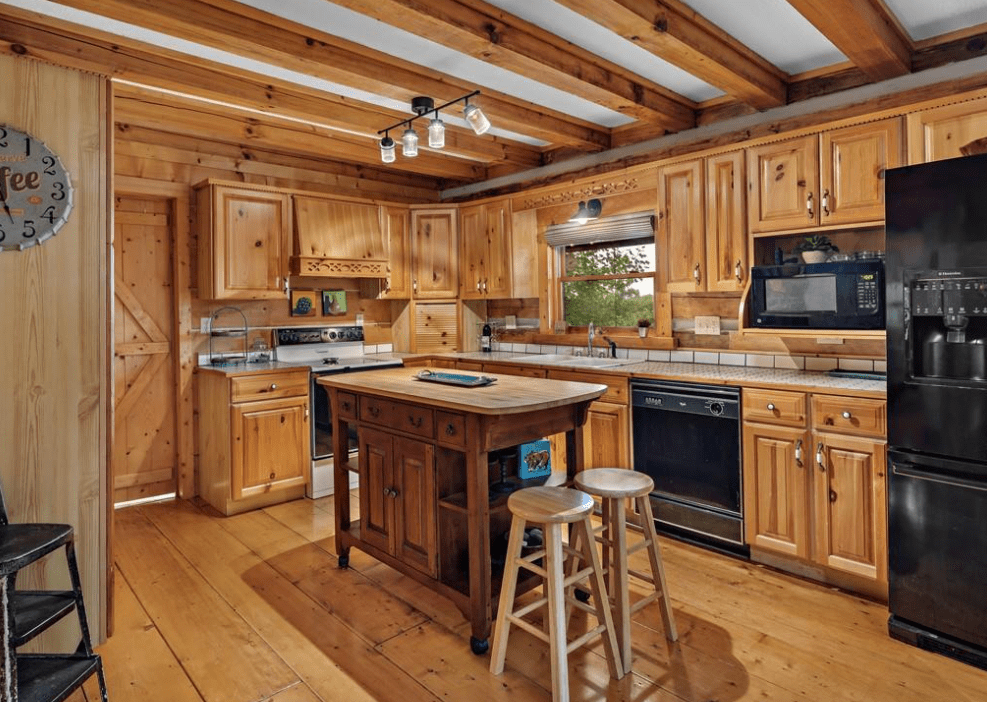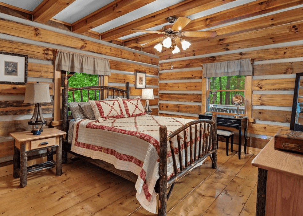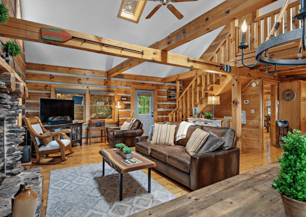 This 1999 era 6 x 14 Timberwright Log Home in North Carolina is stunning. This Timberwright is nearly 2,300 square feet, and it has all the views from the porches, wrap around deck, and patio area. The structure of the outdoor living area is stunning, too.